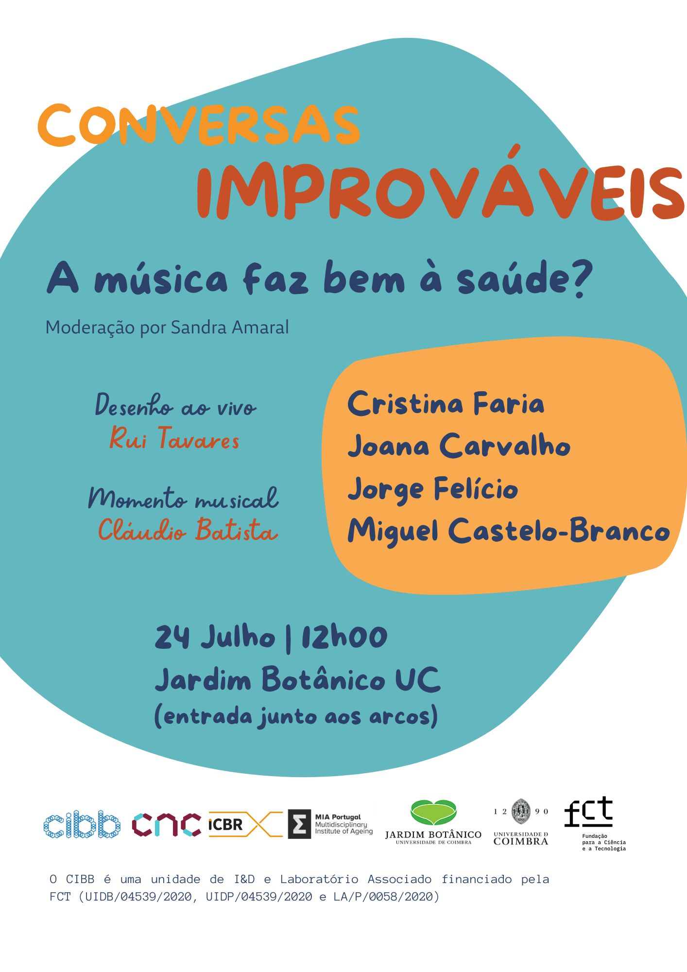 The next Conversa Improvável (Improbable Conversation), with the theme Is music good for your health?, will take place on July 24th, from 12 noon to 1pm, at the University of Coimbra's Botanical Garden, at the entrance to the Arches. The talk will feature Professor Cristina Toscano Faria, a researcher at the Centro de Estudos de Sociologia e Estética Musical (CESEM) at the Universidade Nova de Lisboa and a lecturer in the scientific area of music at the Escola Superior de Educação de Coimbra (ESEC). Dr. Joana Carvalho, a speech therapist trained in music therapy and director of the clinic “Joana a terapeuta e a mãe” (Joana the therapist and the mother), Dr. Jorge Felício, a music therapist and coordinator of the music therapy office at the Coimbra pediatric hospital, and Professor Miguel Castelo-Branco, a physician and neuroscientist at the Faculty of Medicine of the University of Coimbra and director of the Center for Biomedical Imaging and Translational Research (CBIT). The talk will be moderated by Sandra Amaral, a researcher at CNC-UC/CIBB, and will be illustrated live by comic artist Rui Tavares. The cultural moment will be hosted by trumpeter Cláudio Batista.