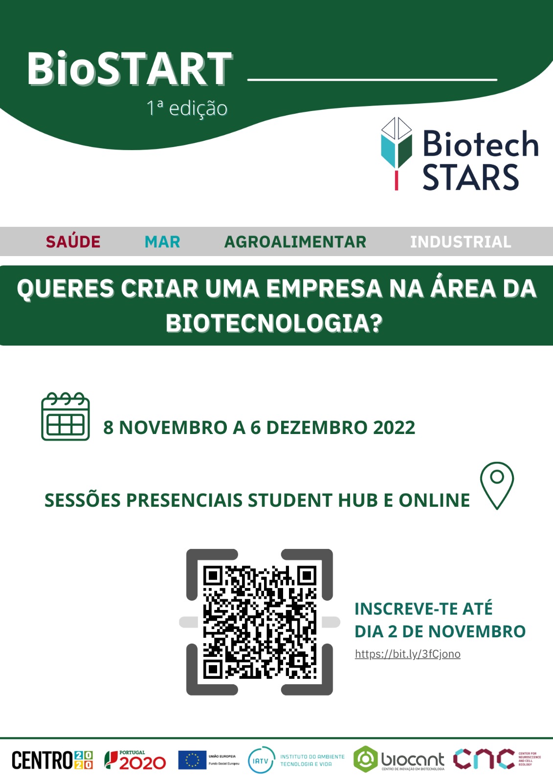 The BIOSTART program is coordinated by CNC-UC, as part of a project to promote bioentrepreneurship in the Central Region, BiotechSTARS , which aims to provide ideation, training and mentoring programs for the public interested in the area. In addition to this training action, the project, which runs until June 2023, will promote other actions, namely: the IGNITE initiative, to promote the discovery of innovative ideas with entrepreneurial potential; the BIOBOOST programme, an initiative to bring together participants and mentors in the area of bioentrepreneurship, with a view to developing new business initiatives; the BiotechSTARS Academy, to stimulate bio- entrepreneurship among the school public; and the BIOaCOMM activity, which aims to raise society's awareness of the importance of bioentrepreneurship as a vehicle for responding to many of the contemporary economic and social challenges.